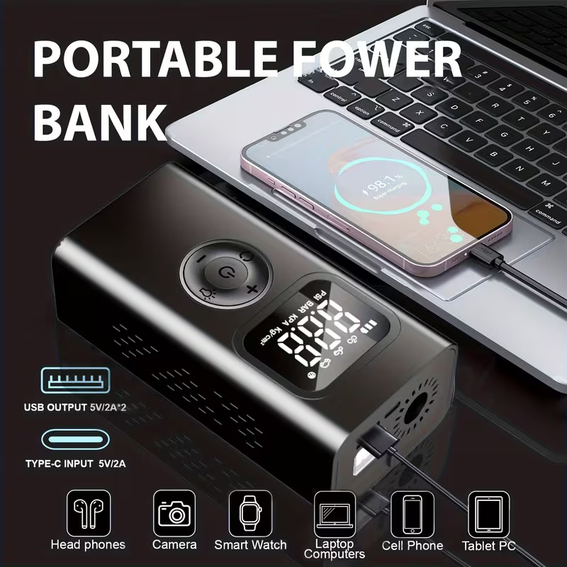 Featuring a 150 PSI Air Compressor, Jump Cable Box, Portable Starter for 1.21 L of Gasoline/101.44 Ounces of Diesel Engines, LCD Display, 3-Mode LED Flashlight, Fast Charging USB-C, Lithium Polymer Battery