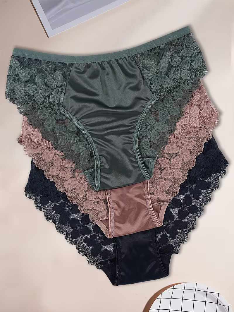 3pcs Solid Color Satin Sheen Fabric Floral Contrast Lace Patchwork Panties Soft Breathable Mid-Rise Thong for Women