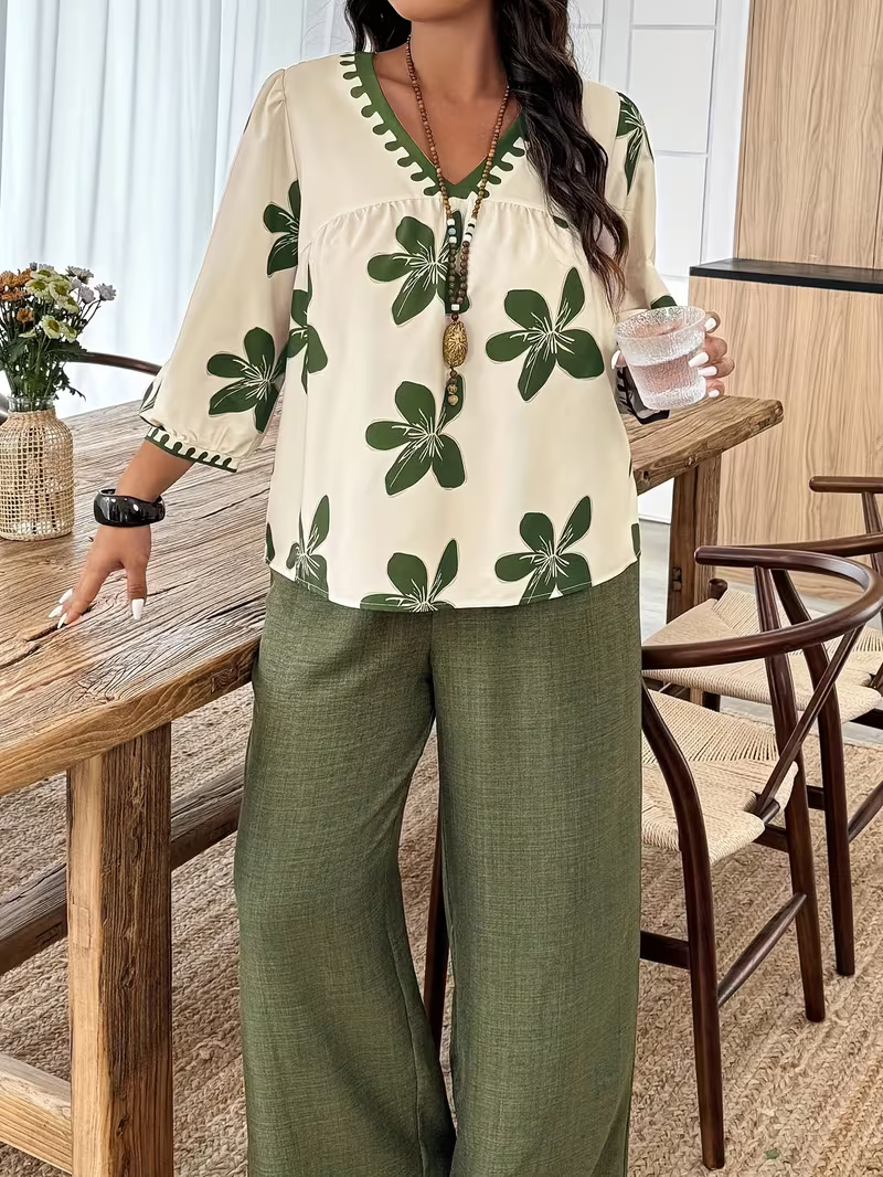 New Spring/Summer Fashion Print Loose Mid-Sleeve V-Neck Top + Wide Leg Pants Two-Piece Outfit,
